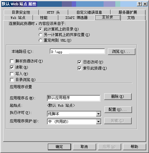 3.在隨后出現的站點屬性窗體上面點擊“主目錄”選項卡。點擊“瀏覽”按鈕,選擇D:app文件夾。設置好文件夾后點擊“確定”按鈕退出站點屬性窗體。