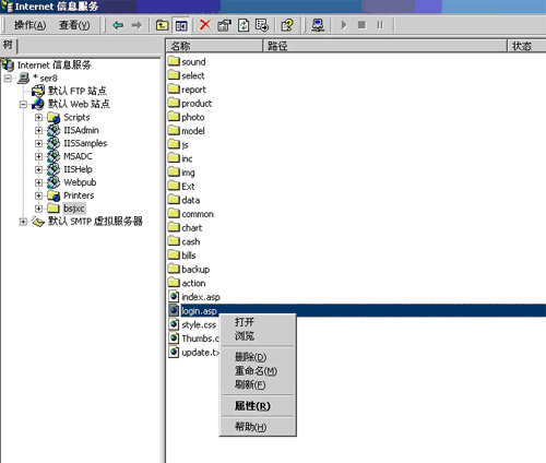 4.雙擊默認web站點,在右側的列表中雙擊進入bsjxc文件夾下面。找到login.asp,選中并右擊鼠標,點擊瀏覽項。