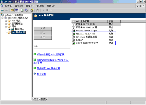②控制面板->管理工具->IIS(Internet服務器)-Web服務擴展->在服務端的包含文件->允許。如下圖所示: