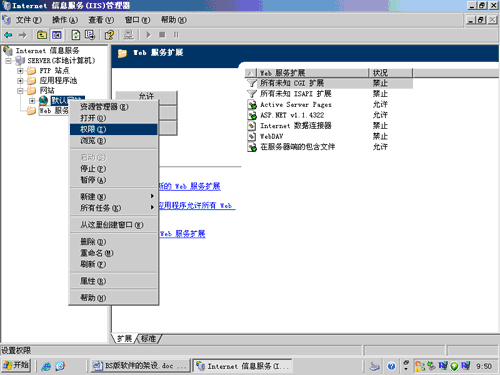 ①控制面板->管理工具->IIS(Internet服務器)-默認網站-右鍵)權限,如下圖所示: