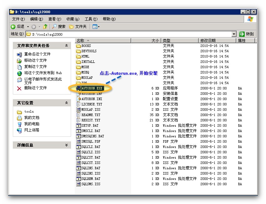 第1步: 以 Windows 2003 下安裝 Microsoft SQL Server 2000 Personal版本為例。將 Microsoft® SQL Server™ 2000 光盤插入 CD-ROM 驅(qū)動(dòng)器。如果該光盤不自動(dòng)運(yùn)行,請雙擊該光盤根目錄中的 Autorun.exe 文件。