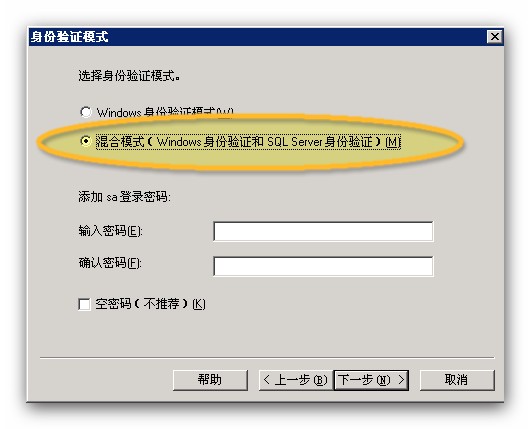 第15步:選擇"混合模式",并輸入sa(管理員)密碼,如下圖: