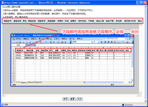 2.制作Excel商品資料模板,字段順序需按照下方的表格字段順序,必須一一對應,不可增減。
