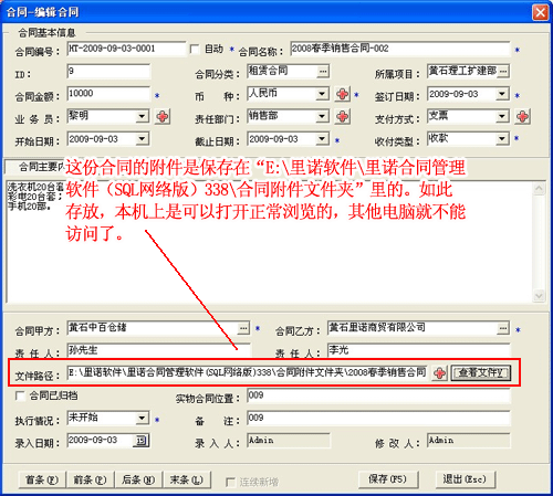 如上圖所示,這份合同的附件是保存在“E:里諾軟件里諾合同管理軟件(SQL網絡版)338合同附件文件夾”里的。如此存放,本機上是可以打開正常瀏覽的,其他電腦就不能訪問了。