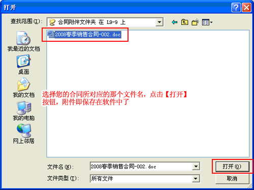 雙擊打開,選擇您的合同所對應的那個文件名,點擊【打開】按鈕,附件即保存在軟件中了。