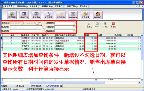 ②其他明細表增加查詢條件,新增設不勾選日期,就可以查詢所有日期時間內的發生單據情況。銷售出庫單直接顯示負數,利于計算直接顯示。