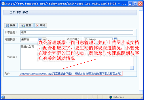 2.辦公管理新增工作日志管理,并可上傳圖片或文檔,配合相應文字,更生動的體現跟進情況,不管處在哪個環節的工作人員,都能及時快速跟蹤到與客戶有關的活動情況;