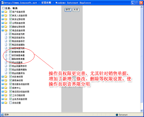 4.操作員權限更完善,尤其針對銷售單據,增加了新增、修改、刪除等權限設置。使操作員職責界限分明。