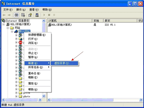 打開控制面板——管理工具——Internet信息服務(wù)——展開默認網(wǎng)站——鼠標右鍵新建——虛擬目錄,如下圖所示: