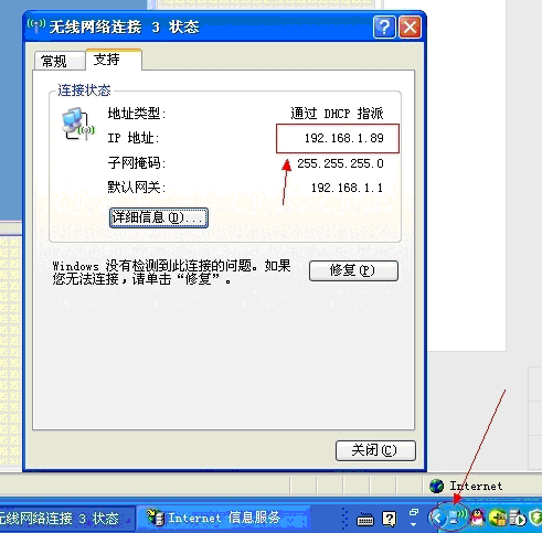 ①獲取您服務(wù)器電腦的IP地址,雙擊電腦右側(cè)下方電腦圖標——支持——獲取到的IP地址為“192.168.1.89”