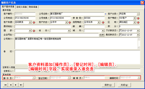 1. 客戶資料、合同錄入、銷售單、收款單添加[操作員]、[登記時(shí)間]、[編輯員]、[編輯時(shí)間]字段。實(shí)現(xiàn)誰錄入誰負(fù)責(zé)。