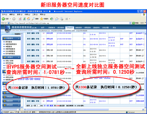 不難看出,之前的VPS服務器空間查詢1330條單據所需1.0781秒,而現在全新上線的獨立服務器空間查詢1330條單據僅需0.1250秒,速度快了將近9倍!可以大大節約操作時間,提高工作效率。