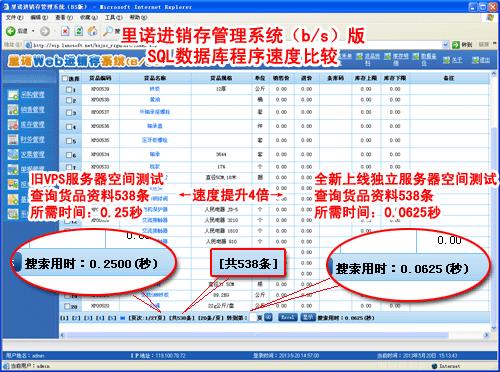 舉例山東日照某客戶使用的里諾進銷存管理系統(b/s)版SQL數據庫程序速度對比圖: