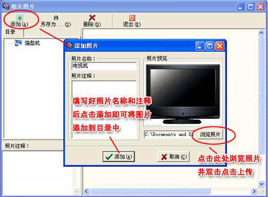 軟件支持添加圖片功能,在軟件主界面上點(diǎn)擊“圖片”按鈕進(jìn)入相關(guān)窗體,點(diǎn)擊“添加”可以將圖片直接上傳到軟件里,也可以將圖片另存在指定文件夾中,添加進(jìn)去的圖片可通過目錄進(jìn)行瀏覽,讓設(shè)備樣式一目了然。