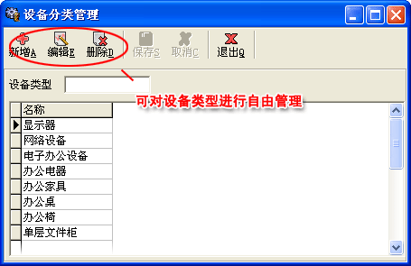 軟件支持對資產(chǎn)及設(shè)備進(jìn)行分類管理,可自由“新增”、“編輯”、“刪除”設(shè)備類型名稱。