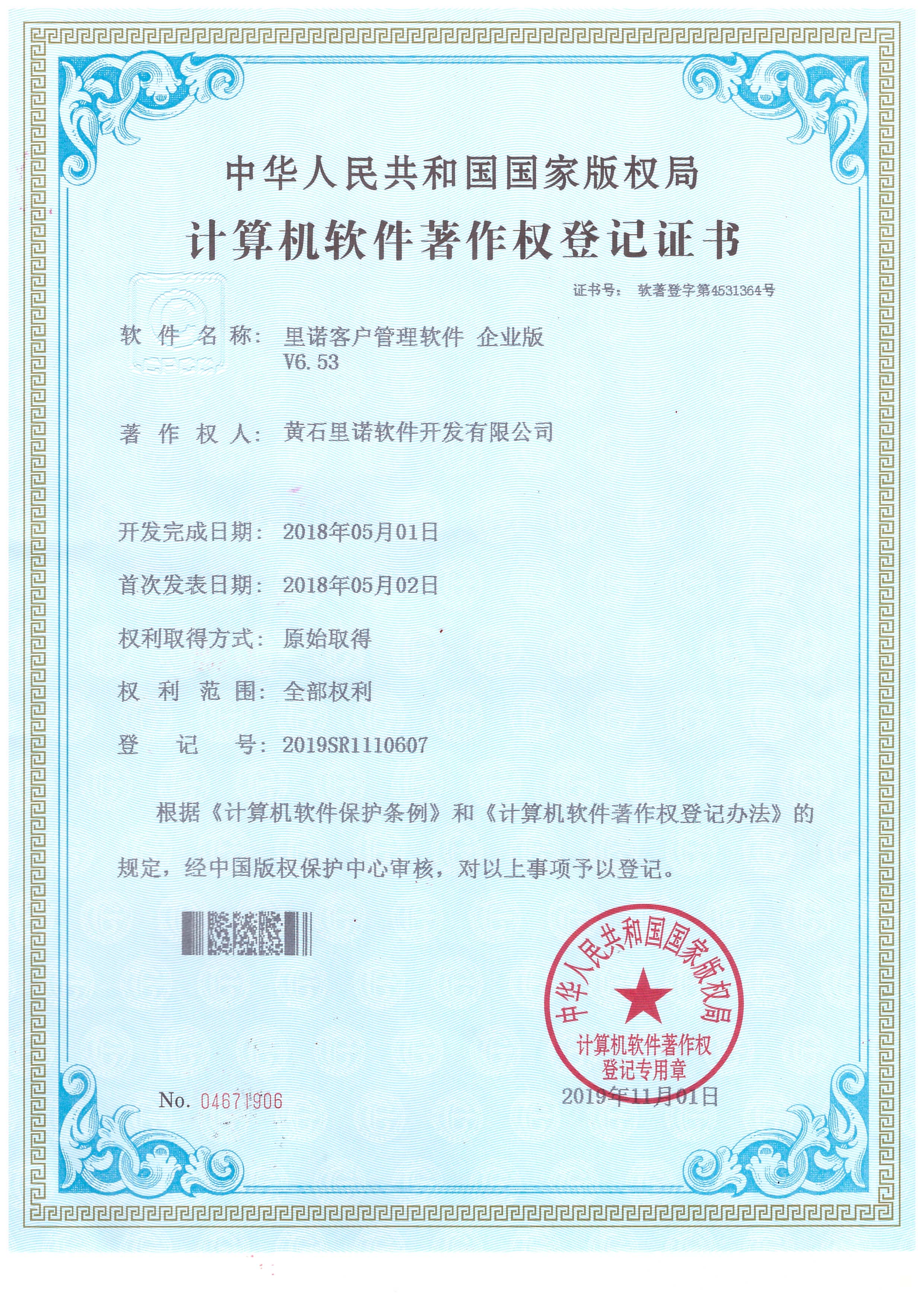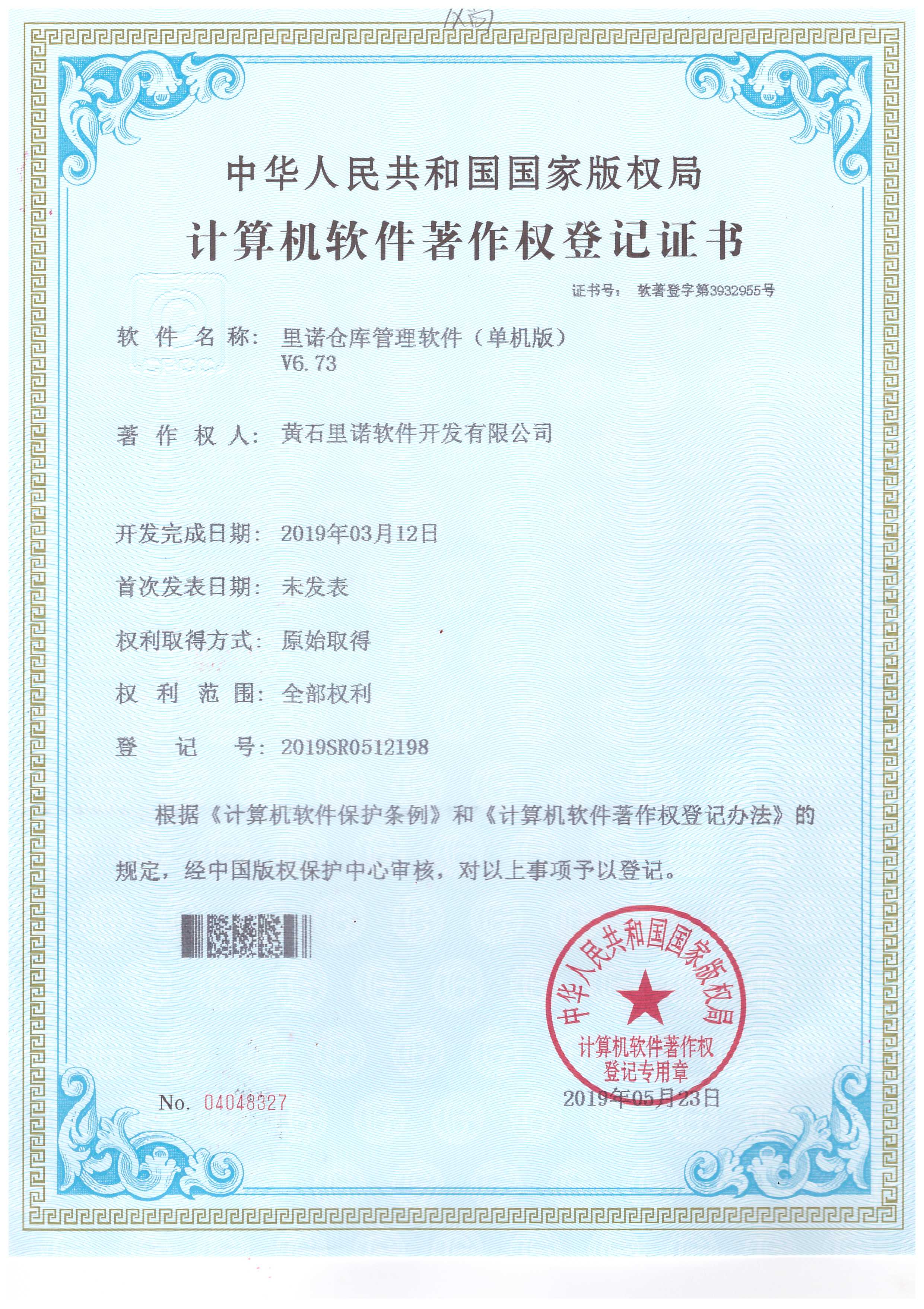 里諾軟件在2019年取得了里諾倉(cāng)庫(kù)管理軟件和客戶管理系統(tǒng)的兩張軟件著作權(quán)證書,下面就是證書的掃描件!
