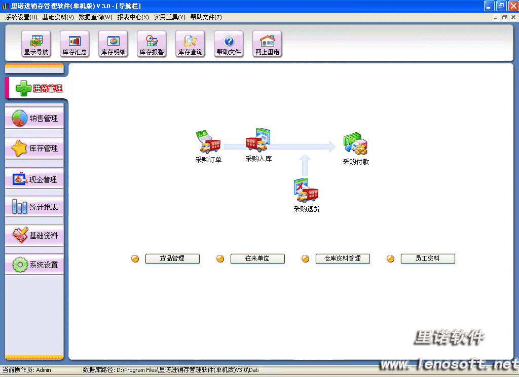 1> 下面我們以進(jìn)貨管理為例,講述如何制做入庫單.點擊里諾進(jìn)銷存導(dǎo)航界面上的【進(jìn)貨管理】,再點擊【采購入庫】按鈕,如下圖所示: