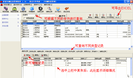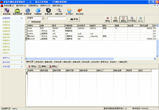 可在列表中繼續錄入某車輛的維修記錄、投保記錄、繳費記錄、年審記錄、事故記錄、違章記錄、投訴記錄、出車記錄、費用支出、其他收入、油耗記錄。