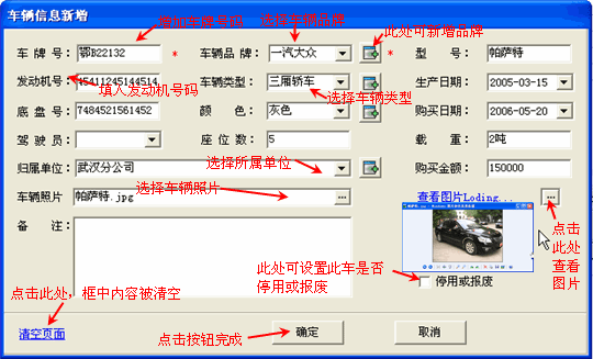 錄入:車牌號,車輛品牌,車輛型號,發動機號,車輛類型,生產日期,底盤號,車輛顏色,購買日期,駕駛員,座位數,載重,歸屬單位,購買金額,設置車輛照片,備注。