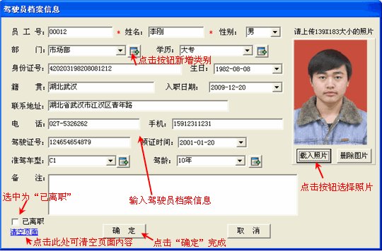 錄入:員工號(由系統自動生成),姓名、性別、部門、學歷、身份證號、生日、籍貫、入職時間、聯系地址、電話、手機、駕駛證號、領證時間、準駕車型、駕齡、職工照片。備注。