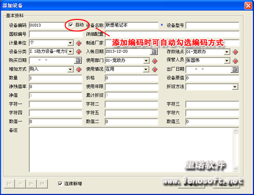 在添加設備時當你選擇折舊方法后,記得填寫好凈殘值率和使用年限,同時也可勾選自動編碼方式,讓用戶用最少的操作便可完成更多的功能操作,省時省力。