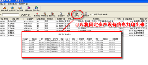 軟件支持打印:固定資產設備基本信息、固定資產設備詳細信息、固定資產分類統計表、固定資產部門統計表、固定資產標簽打印和固定資產檔案卡打印