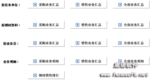5. 完備的統計匯總,可隨時根據日期區間、鋼材名稱、業務員、倉庫名稱、鋼種、貨品編碼等字段查詢及打印業務匯總表、業務明細表、及銷售排行情況,讓您多方位為鋼材銷售的經營決策提供切實可靠的數據服務。